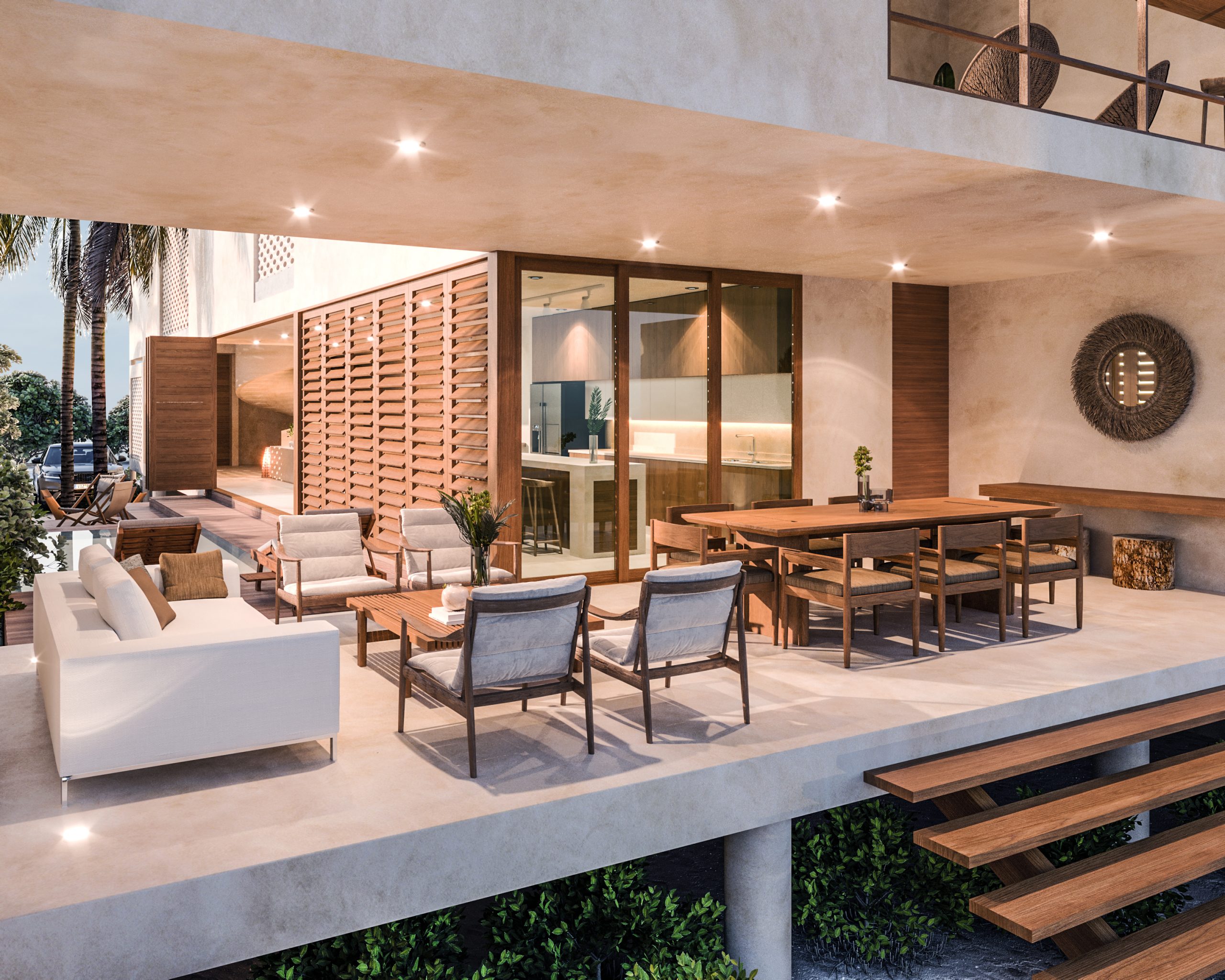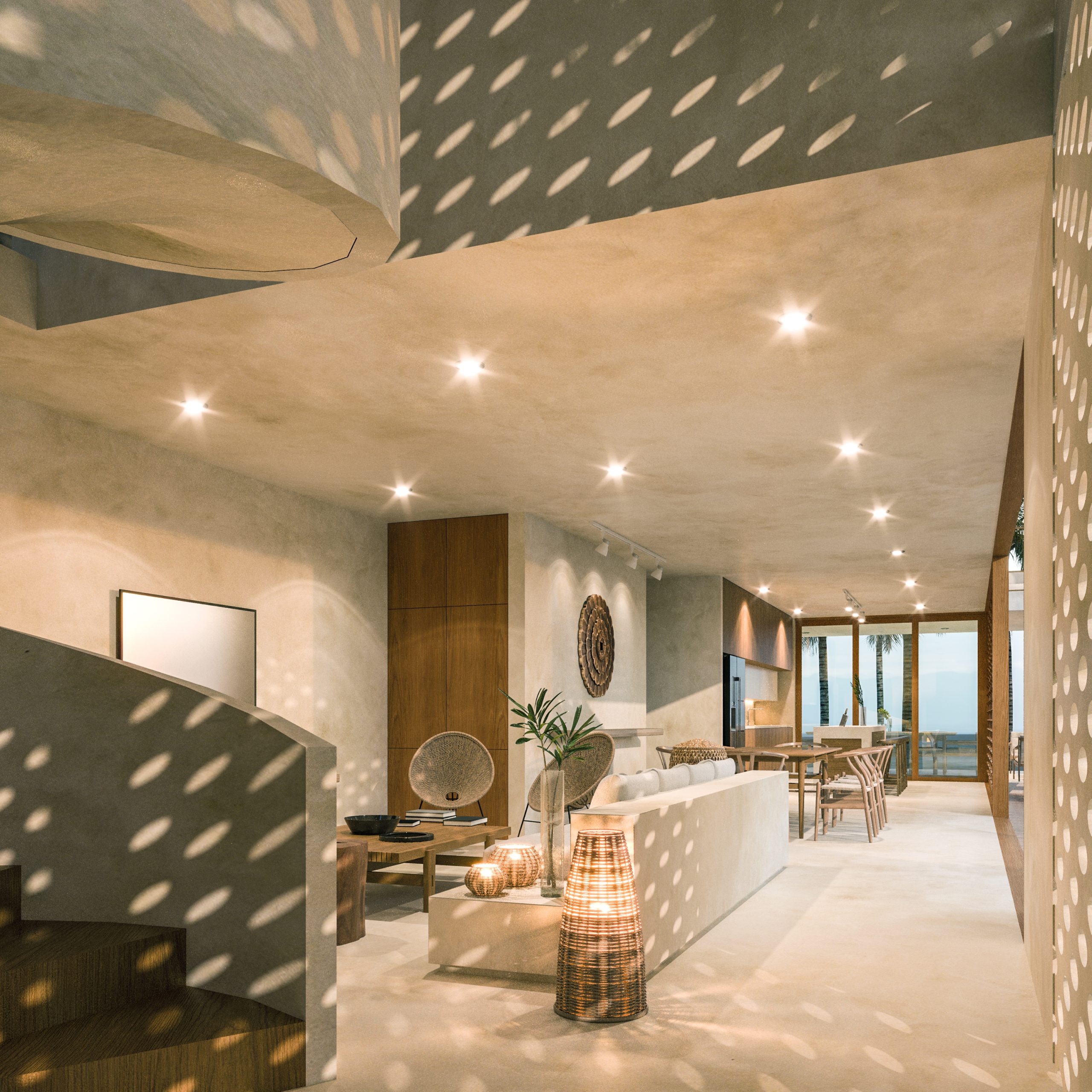 El diseño interior integra de manera fluida la mayoría de los espacios sociales en un área única, que se conecta fácilmente con los espacios exteriores. Esta disposición fomenta la convivencia entre los residentes y sus invitados, mientras que la planta alta se reserva para ofrecer un ambiente más privado.